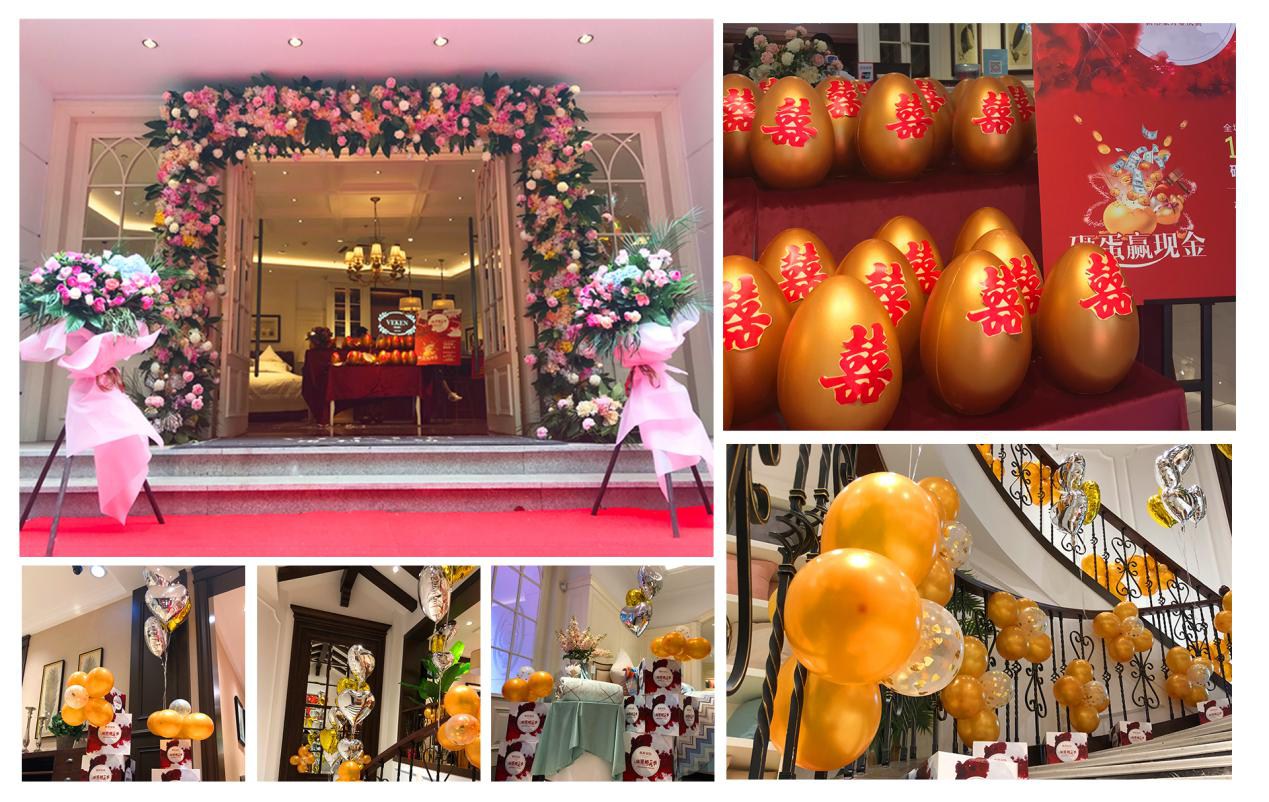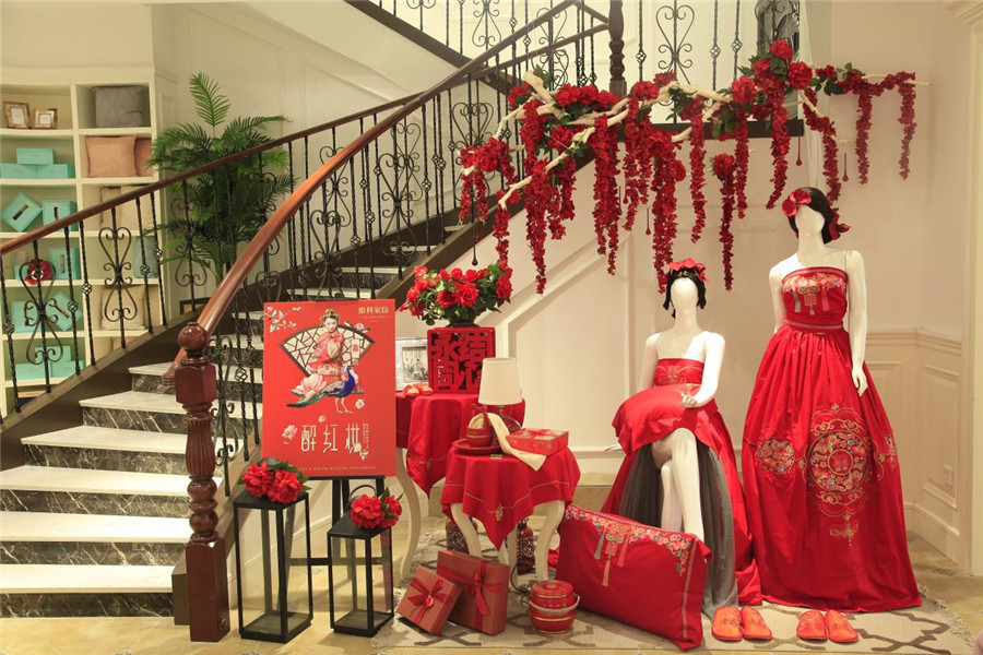 為帶給顧客更直觀舒適的消費體驗,在空間設計上,維科家紡和義店二樓婚慶家紡場景展示區(qū)摒棄了家紡行業(yè)傳統(tǒng)高柜+展床的方式,將300余平的空間分隔成7個實景樣板間,真實體現(xiàn)婚慶床品在日常家居生活中的效果,也能滿足顧客在選購婚慶床品的同時,一站式解決對婆婆禮、長輩禮以及婚慶小件(子孫桶、火銃、虎頭鞋等)的需求。由于該創(chuàng)意目前在家紡行業(yè)中應用較少,可借鑒之處寥寥無幾,公司各部門投入了大量的時間精力不斷對方案進行修改,力求盡善盡美。整個二樓還設置了一大一小兩個洽談區(qū),都配備了舒適的沙發(fā)以及精致的茶歇,以供顧客能夠坐下來向?qū)з徳敿毩私獯财返男畔ⅰT陉惲胁贾蒙希敿拘缕纷砑t妝、子孫滿堂、胭脂醉,熱銷品百子納福、麒麟賀滿堂等都被直接鋪設于房間內(nèi),并搭配生活化的情景道具,供顧客選購。